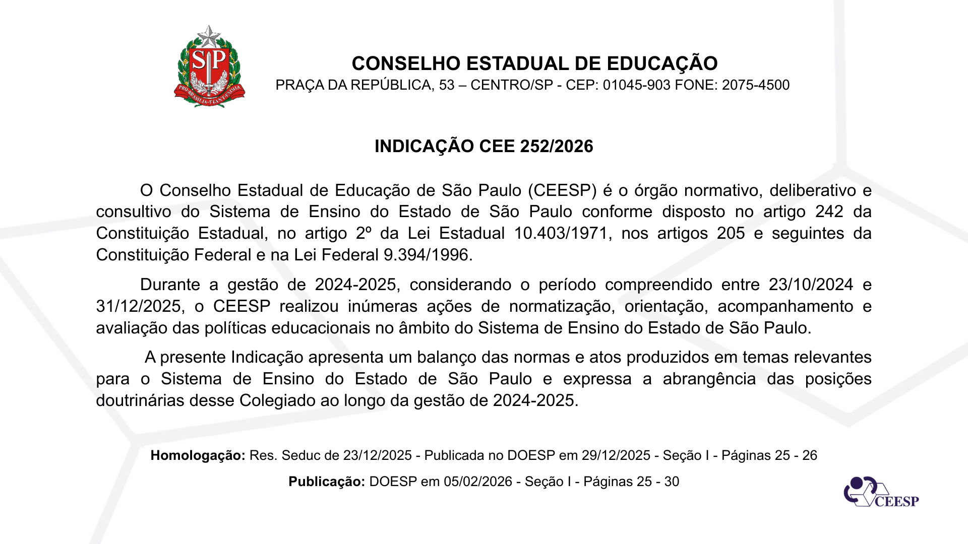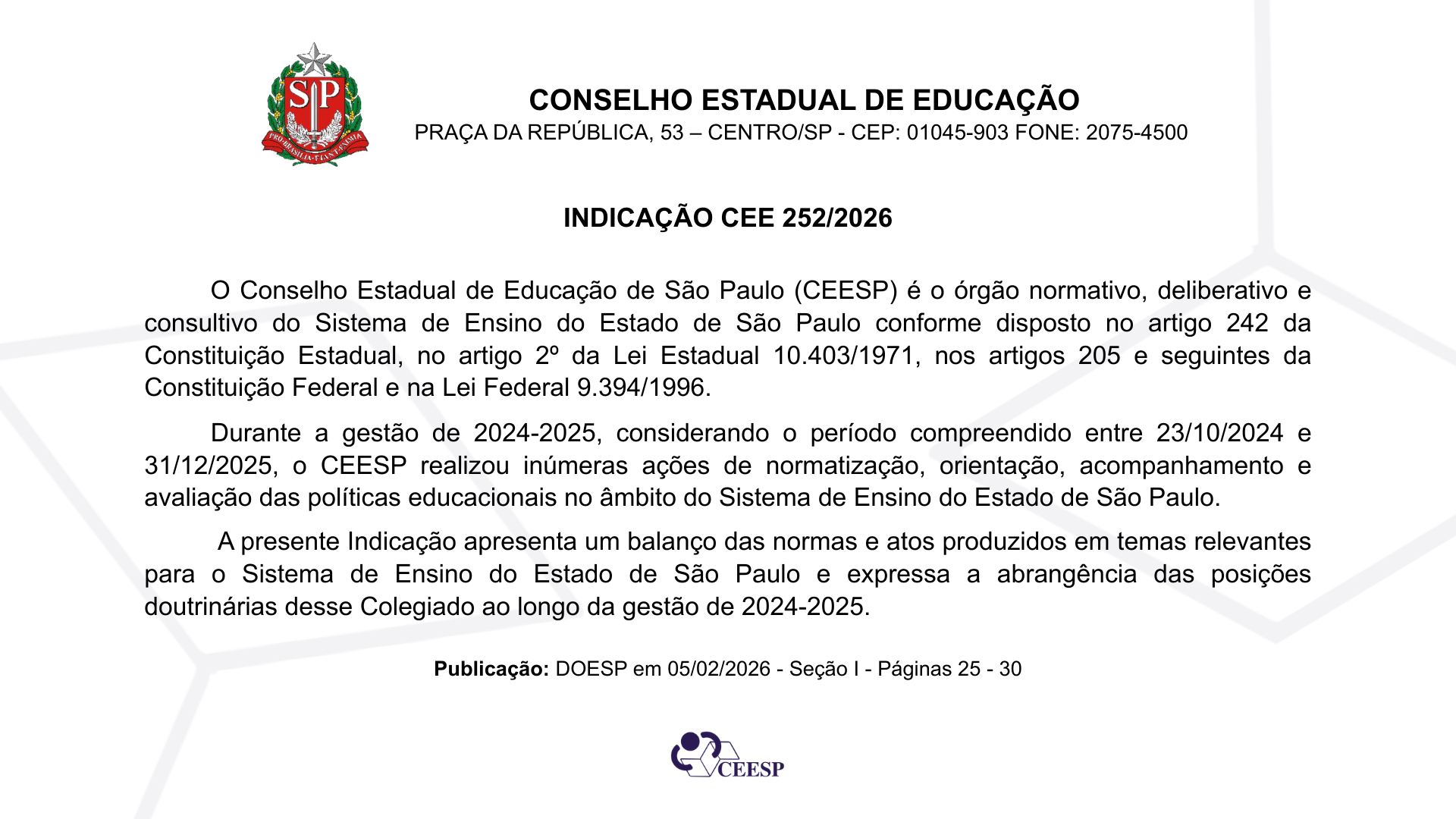 O Conselho Estadual de Educação de São Paulo publicou, no DOESP de 05/02/2026, a Indicação CEE nº 252/2026, que apresenta o balanço das normas e atos produzidos pelo Colegiado no período de 23/10/2024 a 31/12/2025.